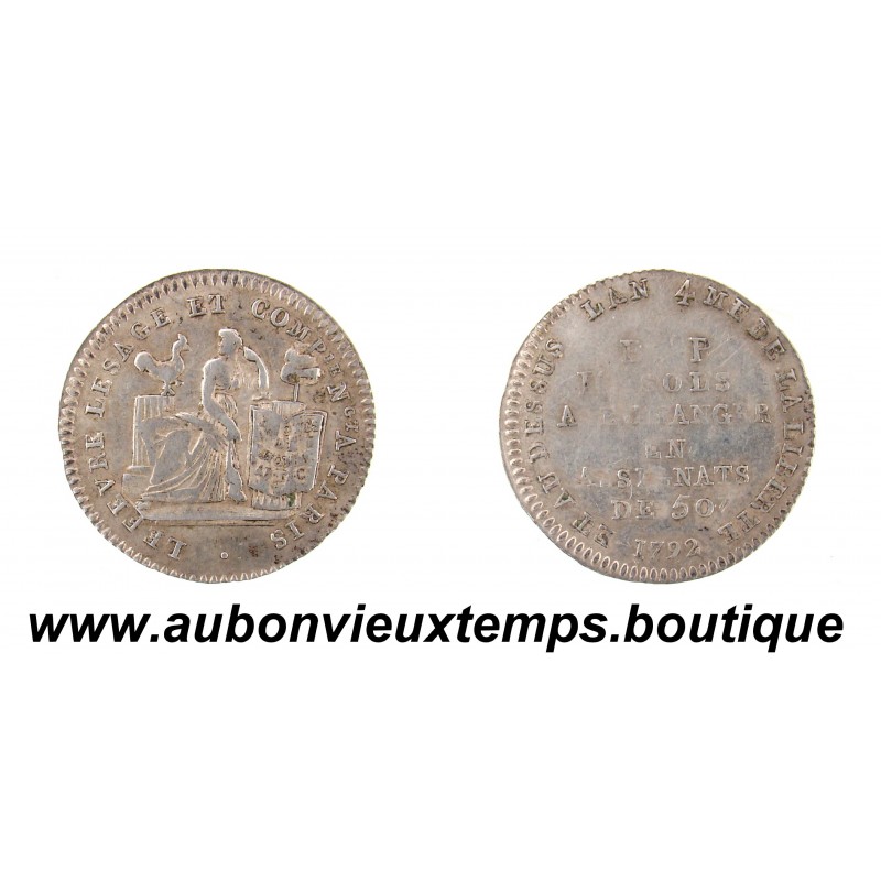 10 SOLS Argent 694 ‰ 1792 ( An IV ) LEFEVRE LESAGE et Cie - PARIS RARE R1 DIM : 21 mm POIDS : 1.55 g Cotation JM 2010 - 122.1 TB+ : 250€ Avers : .LEFEVRE LESAGE ET COMPIE NGT A PARIS. Description : La Liberté assise à gauche, appuyée sur un faisceau surmonté d'une pique et d'un bonnet phrygien, devant la Déclaration des Droits de l'Homme et du Citoyen à l'art V, à gauche, coq sur un cippe. Revers : ET AU DESSUS L'AN 4ME DE LA LIBERTE / 1792. Description : B. P. / 10 SOLS / A ECHANGER / EN / ASSIGNATS / DE 50#.