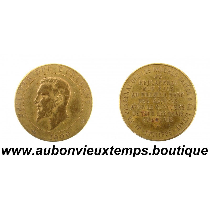 ESSAI 10 CENTIMES ( Module de ) Laiton 1900 PHILIPPE DUC d'ORLEANS RARE R1 DIM : 30.5 mm POIDS : 8.10 g Cotation J.M. 2011 - 1050A.2 TTB : 60€ Avers : PHILIPPE - DUC D’ORLÉANS 1900. Description : Profil à gauche du duc d’Orléans. Revers : JE NE VENGERAI QUE LES INJURES FAITES Â LA NATION PHILIPPE / JE / REPLACERAI / MON PAYS / AU PREMIER RANG / DES NATIONS / AVEC LE CONCOURS / DE TOUS LES VRAIS / FRANÇAIS.