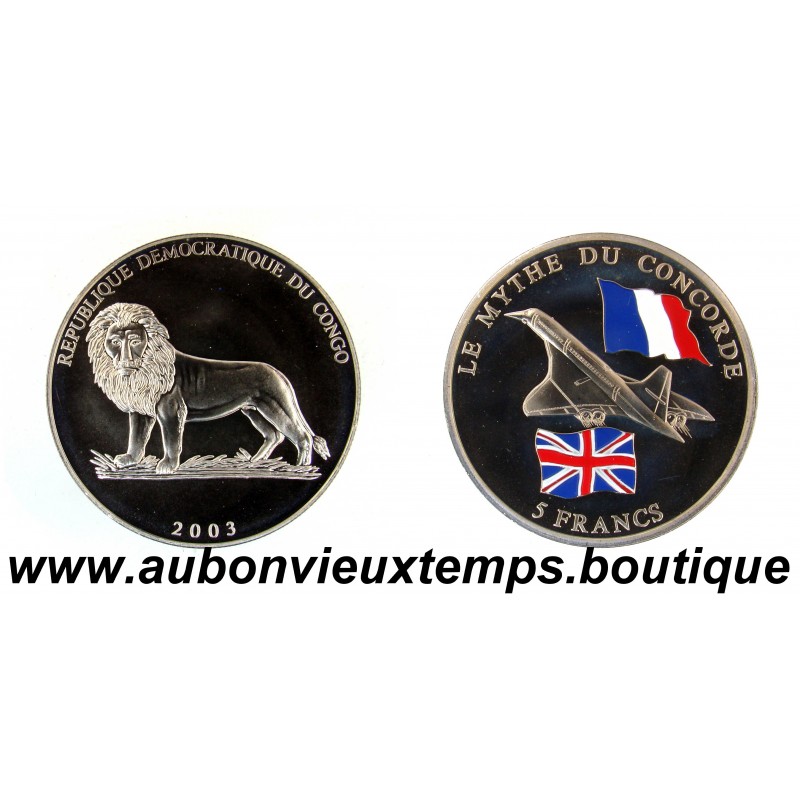 5 FRANCS 2003 Le MYTHE du CONCORDE - CONGO RARE 20 000 ex DIM : 39 mm POIDS : 28 g Avers : REPUBLIQUE DEMOCRATIQUE DU CONGO / 2003. Description : Lion de profil, légende au dessus, date en dessous. Revers : LE MYTHE DU CONCORDE / 5 FRANCS. Description : Concorde, avec les drapeaux de la France et du Royaume-Uni colorisés.