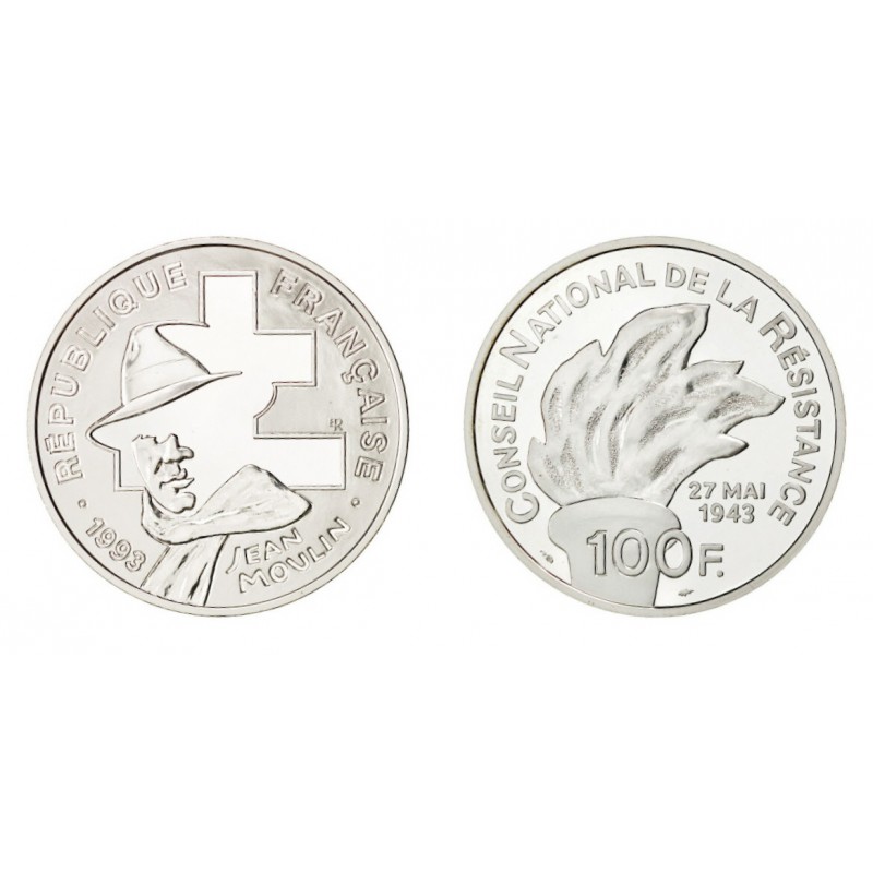 100 FRANCS Argent 900 ‰ BE 1993 JEAN MOULIN RARE 50 000 ex DIM : 37 mm POIDS : 22.20 g et 74 g avec le boitier et CERTIFICAT N° 31722 Cotation FDC Gadoury 2023 : 100€ Avers : REPUBLIQUE - FRANÇAISE / 1993 JEAN MOULIN. Description : Portrait de Jean Moulin avec en arrière-plan la croix de Lorraine. Revers : CONSEIL NATIONAL DE LA RÉSISTANCE / 27 MAI 1943 / 100 F. Description : Un flambeau.