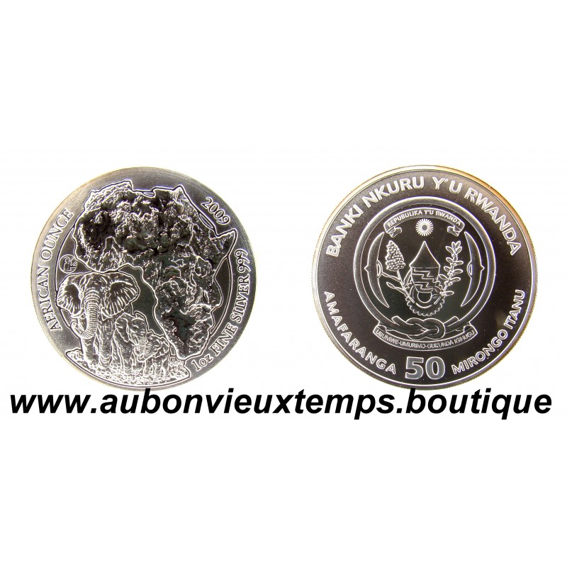 50 FRANCS ONCE Argent 999‰ 2009 ELEPHANT - RWANDA RARE 5000 ex FDC POIDS 31.10 g et 36.25 g avec la capsule DIM : 40 mm Avers : BANKI NKURU Y'U RWANDA / REPUBLIKA Y'U RWANDA / UBUMWI - UMURIMO - GUKUNDA IGIHUGU / AMAFARANGA 50 MIRONGO ITANU. Description : Armes nationales du Rwanda. Revers : AFRICAN OUNCE 2009 / 1oz FINE SILVER 999. Description : Carte de l'Afrique avec en bas à gauche une mère éléphant accompagnée de ses 2 petits.