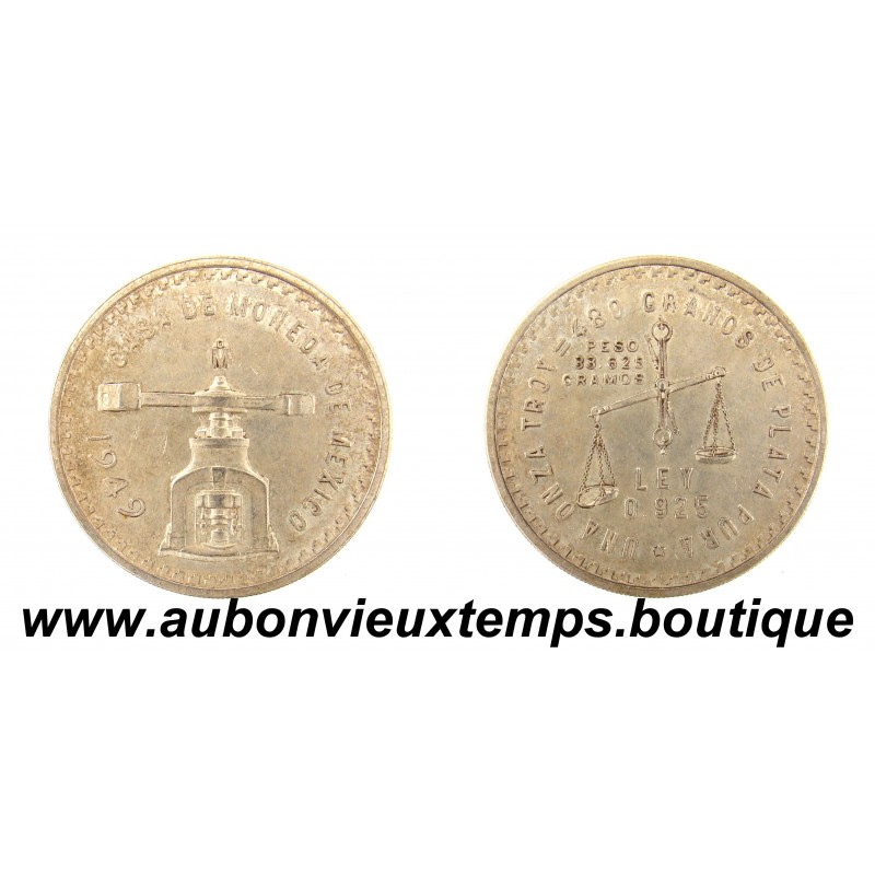 PESO ONZE Argent 925‰ 1942 Mo CASA de MONEDA - MEXIQUE POIDS 33.20 g DIM : 41 mm Avers : CASA DE MONEDA DE MEXICO /1942. Description : Presse à pièces. Revers : UNA ONZA TROY = 480 GRANOS DE PLATA PURA / PESO 33.625 GRAMOS / LEY 0.925. Description : Balance.