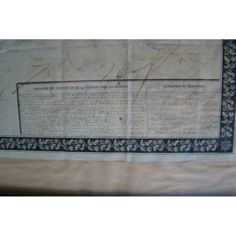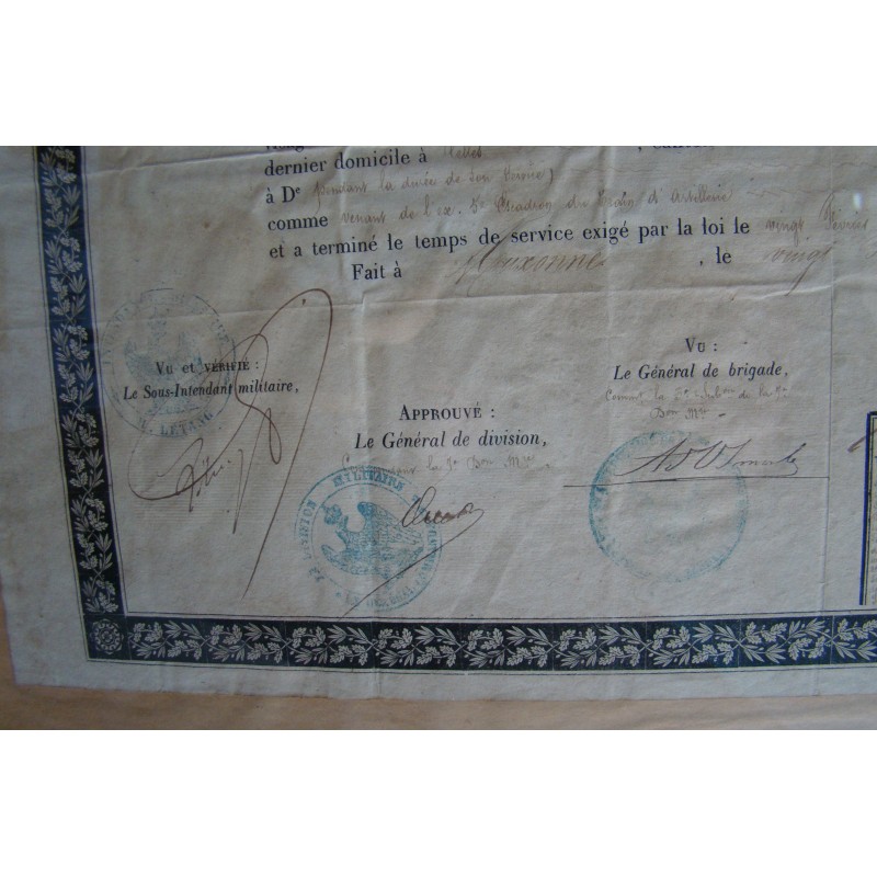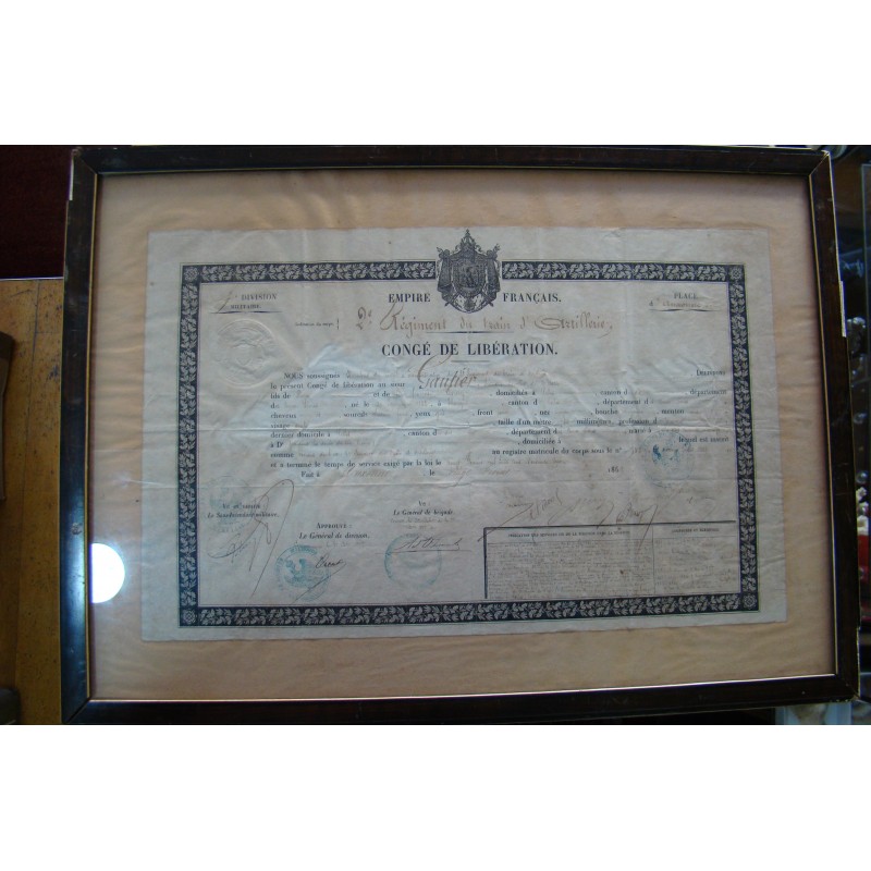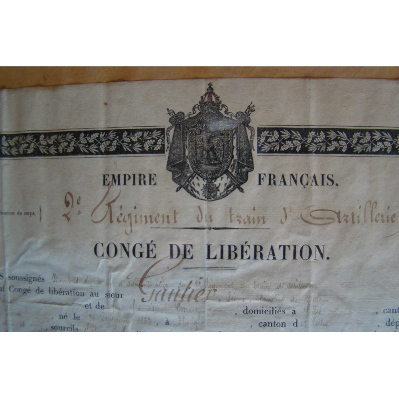CONGE de LIBERATION 20.02.1869 - 2ème REGIMENT du TRAIN d'ARTILLERIE - EMPIRE FRANCAIS DIM : 418 mm x 265 mm - Cadre : 515 mm x 378 mm Poids : 1500 g avec le cadre